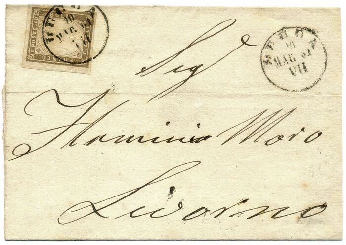 Italiaanse oude staten - Sardinië 1861 - Vittorio Emanuele II, 10 centesimi bistro grigio scuro su busta per Livorno - Sassone 14Cf