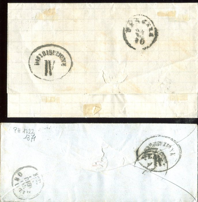 Brief van Milaan naar Venetië 13 oktober 63 met 40 cent met filet. Envelop met gedeeltelijk vensteradres van Bologna 10 juni 62 naar Venetië met dubbele opdruk van 5+20 cent. Zeer goede set met margezegels. Handtekening A. Diena. Catalogus € 700,00+++