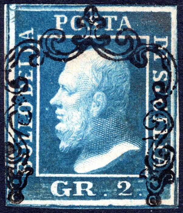 Italiaanse oude staten - Sicilië 1859 - 2 gr. dark cobalt, 1st plate, Naples paper, used – historical certificate by Dr Giulio Bolaffi - Sassone n° 6c