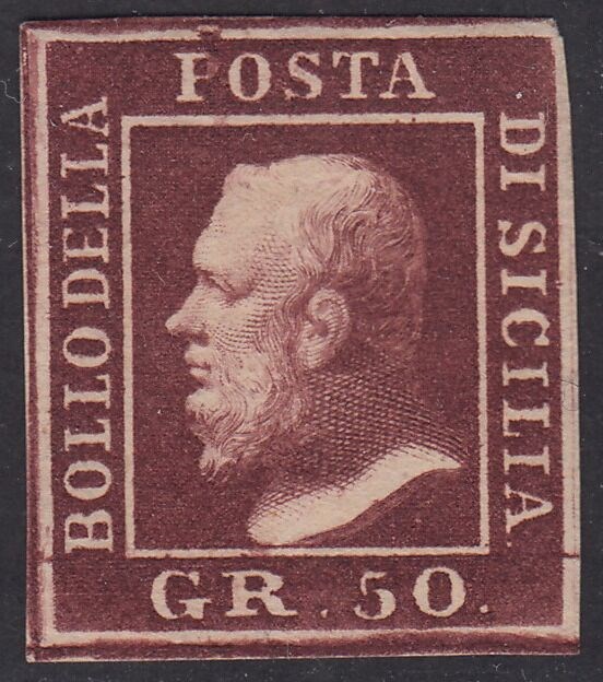 Beeltenis van Ferdinand II van Bourbon, gr. 50 donker paarsbruin lakpapier Napels
