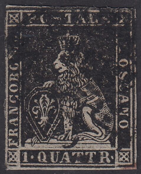 1e uitgave, 1 quattrino zwart op grijs papier en kroonwatermerk