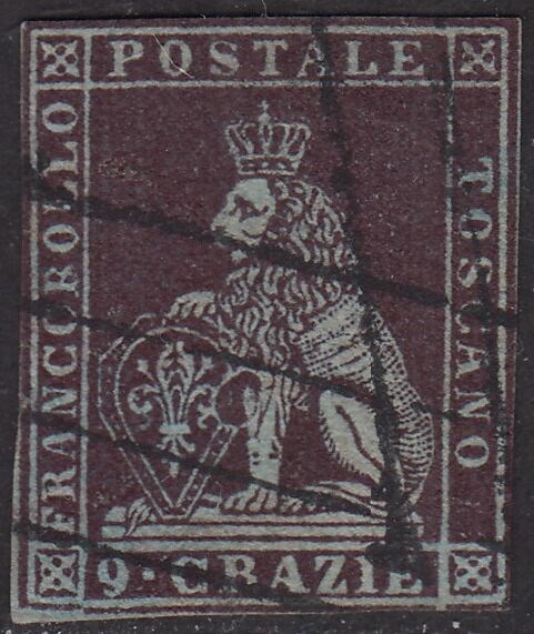 1e uitgave, 9 zeer donkerbruine violette gekken op lichtblauw papier en kroonwatermerk