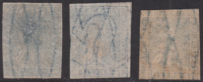 2e uitgave, 6 gekke lichtblauwe, felblauwe en donkerblauwe golvende lijnen op wit watermerkpapier, d.w.z. de drie gecatalogiseerde kleurschakeringen.