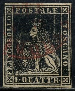 Italiaanse oude staten - Toscane 1857 - Medici Lion with crown, 2nd issue. 1 quattrino black. With certificate. - Sassone N. 10