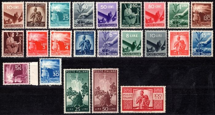 Italiaanse Republiek 1945/1948 - ‘Democratica’ complete set of 23 values, all MNH** with very good/good centring – very good quality - Sassone n° 543/565