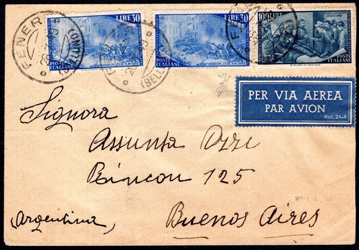 Italiaanse Republiek 1948 - Beautiful aerogramme stamped in rate for 160 lire with the ‘Risorgimento’ set 100l. + 30 l. (x2) - Sass. n° 591+589