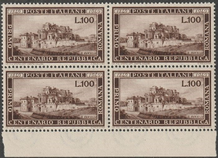 Italiaanse Republiek 1949 - Roman Republic 100 l. brown, sheet margin block of four, centred, intact, rare, luxury - Sassone n.600