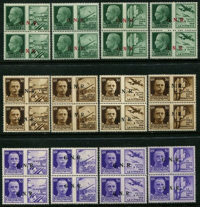 Italië 1944 - RSI – Propaganda, 12 values in vertical pairs with Brescia GNR overprint of the 2nd and 3rd type. - Sassone N.13/24 II-III