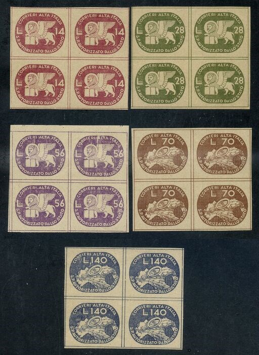 Italië 1945 - Lieutenancy, Corrieri Alta Italia (Coralit), St Mark’s Lion and bicycle, 5 values in block of four - Sassone N. 3/7