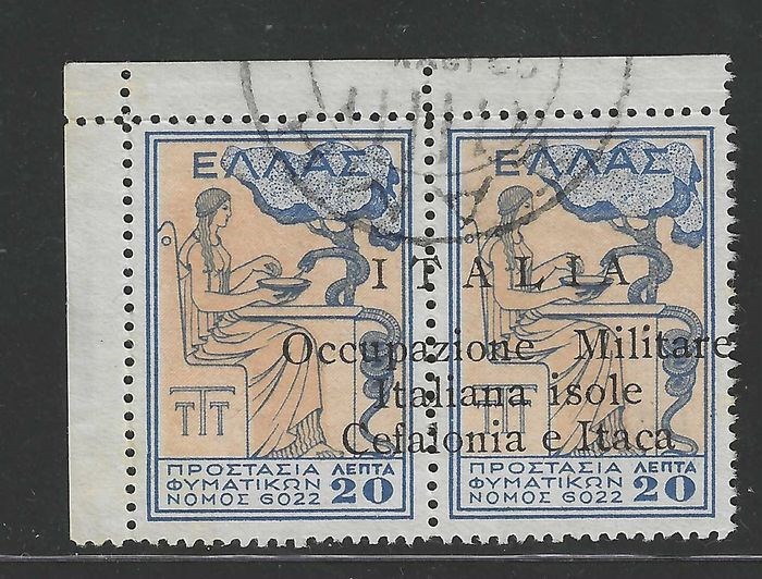 1941 Cefalonia e Itaca, Argostoli, 20+20, geverifieerd en geclassificeerd als positie 1 van de 1e editie (waarschijnlijk door Perini, gemakkelijk herkenbaar geschreven in vergelijking met andere exemplaren, geclassificeerd en nooit ondertekend), met opdruk sterk naar rechts verschoven, met de "e" van "militair" raakt de juiste inkeping - zie Sassone's notitie. Bladhoek en zeer fris. Sassone 2023 nr. 33oi, 3500€. FtoBiondi.