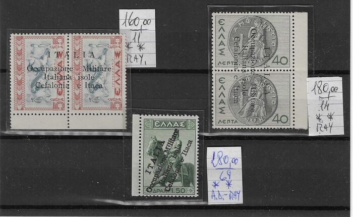 3 prachtige Griekse opdrukzegels voor de eilanden Kefalonia en Ithaca, nieuw met intact gom, weergegeven in de Sassone catalogus respectievelijk op nr. 11 - 14 van het hoofdstuk plus nr. 69 voor de Argostoli-uitgave met de prijzen van euro 160 + 180 + 280 voor een totaal van 620