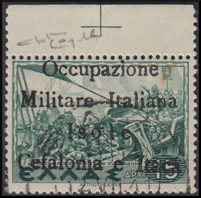 Mythologische van Griekenland 15 drachmen groene hand overdrukt (Ithaca, hoofdstad O) "Bezetting / Italiaans leger / eilanden / Kefalonia en Ithaca"