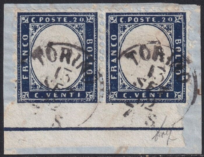 Koninkrijk Italië 1862 - I^ Em. 20 c. coppia non dentellata in basso bordo integrale usata molto rara Certificata - Sassone n.2l