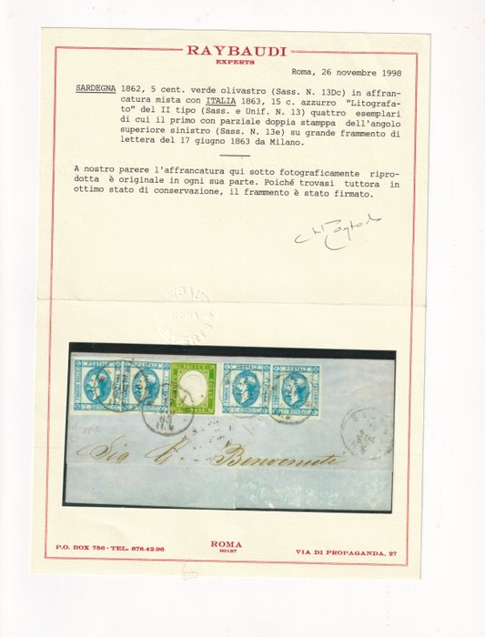 Koninkrijk Italië 1863 - mista Sardegna 5 c. + Regno 15 c. x 3 + 15 c. Doppia Stampa Rarità Certificata - Sassone 13E+13+13e