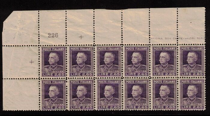 Koninkrijk Italië - 1927 Beeltenis van V.Emanuele III 2,65 Lire - Hoekblok van 12 exemplaren met originele gom intact met plaatnummer op hoek.
