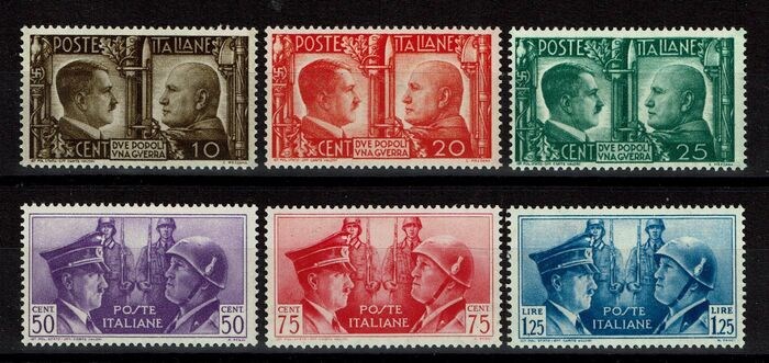 Koninkrijk 1941 Koninkrijk 1941 Axis Hitler Mussolini Italiaans-Duitse Broederschap. Complete Set Nieuw origineel rubber intact. Sassone 452/457 - S. 96. Postfris. Verzending: Verzekerd in Italië - Aangetekend naar het buitenland en de inhoud beschermd met karton en in sommige gevallen ook met cellofaan en airball.