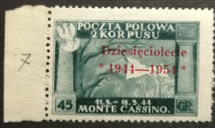Postzegel van de Poolse regering van Londen Koninkrijk Italië 1954 tiende verjaardag van de slag om Montecassino, opdruk Vermilion (Sassone n. 7) mint met licht spoor van scharnier.