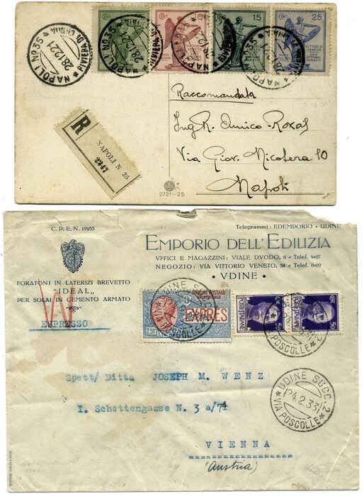Koninkrijk Italië - Umberto50 c. - Floreale 40 c.- Vittoria serie cpl - Espresso L. 2,50. Quattro buste interessanti