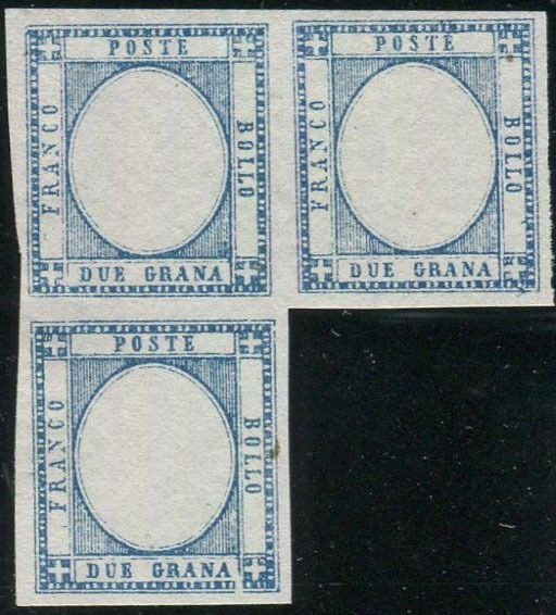 Napolitaanse provincies 1861 - Vittorio Emanuele II, 2 grana, prova nel colore adottato. Blocco di 3 esemplari. Certificato - CEI P23