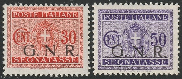 Republikeinse Nationale Garde - Brescia editie 1944 - GNR postage due, overprint offset on the back on 30 c. “small dot after N” + 50 c. oblique - Sassone n.51/If-ed + 53/If-ic