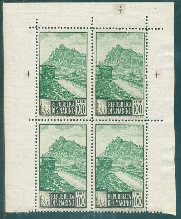 San Marino 1949 - Views, 100 lire, with perforation 14x13. Rare block of four - Sassone 354/I