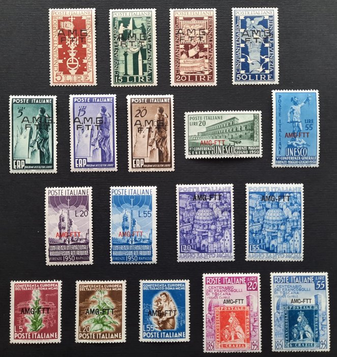 Triëst Zone A. Selectie van complete series tussen 1948 en 1954, inclusief enkele series diensten. Allen met vol rubber en goede/uitstekende centrering.