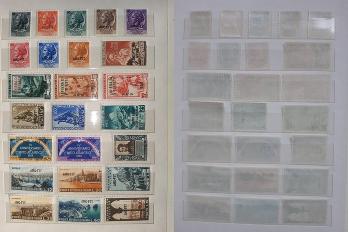 Set van 79 postzegels uitgegeven in de periode 1948-1954 voor de Anglo-Amerikaanse bezetting van Triëst, met OMG-FTT opdruk. Verzameld voor volledige serie.