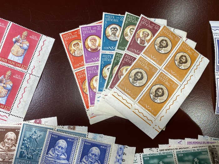 Prachtige bijna volledige collectie van het pontificaat van Johannes XXIII van 1958 (Sede Vacante-serie) tot 1963 (Balzan Prize-serie), inclusief Airmail-uitgaven, alles in blokken van vier met randen of hoek.