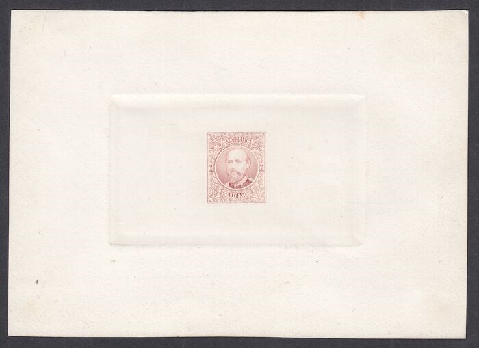 Delpierre proef van de 10 cent Koning Willem III op wit kartonpapier met brede opstaande randen. Op achterzijde plakker/lijm restjes.