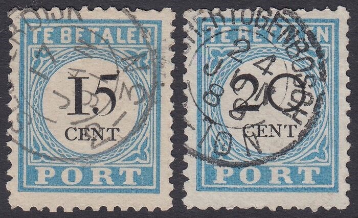 Gestempelde zegels met plakkerrest en potloodnotitie op achterzijde.