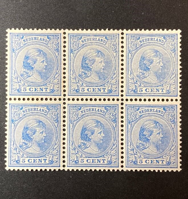 Met klein attest Vleeming: "Zegels in blok van 6 met Abklatsch en tanding echt, gom origineel en postfris, alle min of meer gomloze streepjes..... Twee exemplaren bruin vlekje"
