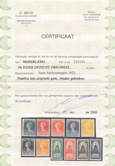 Fotocertificaat C. Muis: "Postfris met originele gom, zonder gebreken. In ieder opzicht origineel", d.d. m27-12-2000.
