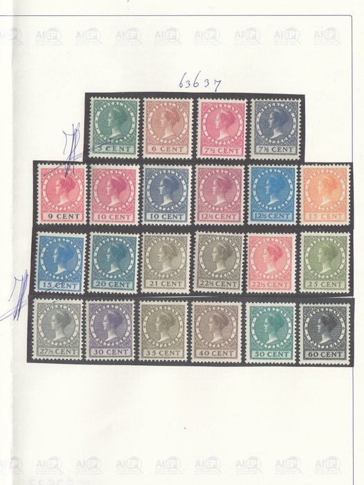 Attest H. Vleeming: "Zegels en tanding echt, gom origineel en postfris, 10 cent rood, 15 cent geeloranje, 25 cent, 30 cent en 35 cent origineel puntje of vezeltje in gom. 15 cent geel, 20, 21, 27.5, 35, 40 en 60 cent gom gelig, overigens geen gebreken", d.d. 18-01-2023.