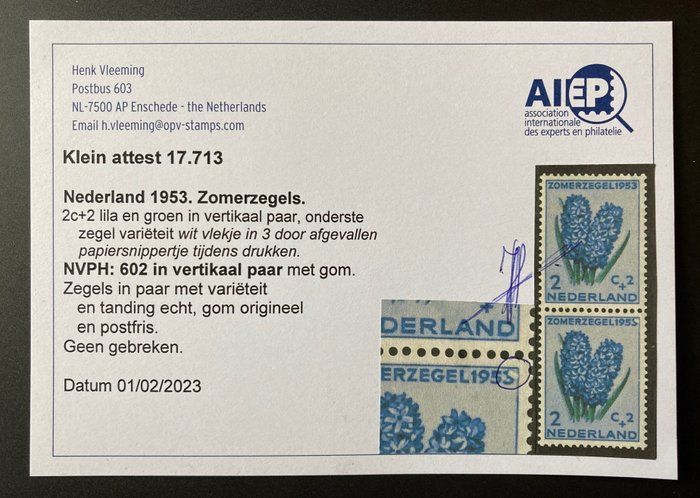 Met klein attest Vleeming: "variëteit wit vlekje in 3 door afgevallen papiersnippertje tijdens het drukken..... Zegels in paar met variëteit en tanding echt, gom origineel en postfris..... Geen gebreken."