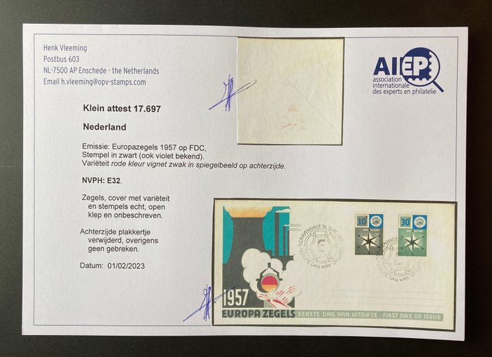 Met klein attest Vleeming: "Varieteit rode kleur vignet zwak in spiegelbeeld op achterzijde..... Zegels, cover met variëteit en stempels echt, open klep en onbeschreven..... Achterzijde plakkertje verwijderd, overigens geen gebreken."