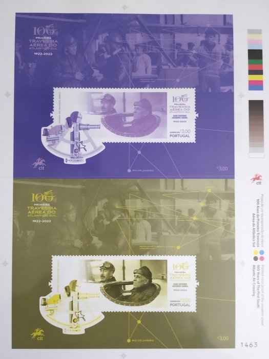 gelimiteerd tot 6.000 genummerde exemplaren, deze editie bevat de kleurproef van de blokdruk van de uitgave «Eerste luchtoversteek van de Zuid-Atlantische Oceaan - 100 jaar», 66 postzegels, 14 blokken