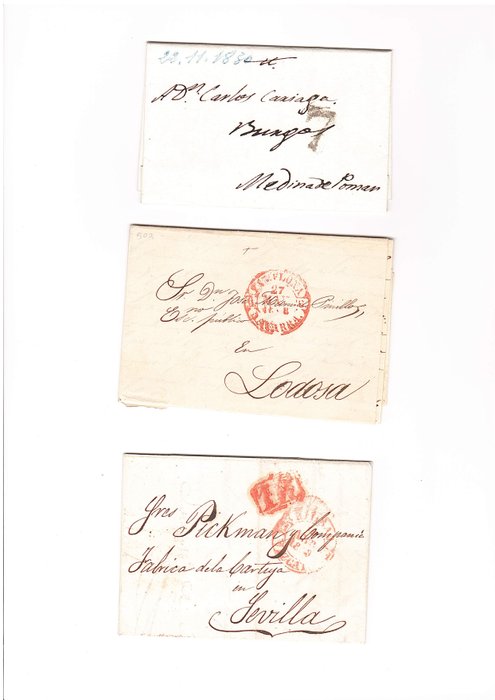 Kleine verzameling van 20 prefilatelistische brieven uit Spanje van verschillende postgrenzen. Bevat merken uit de steden: Madrid, Aranjuez, Cervera, Barcelona, Pamplona, Burgos, Bilbao, Medina del Campo, Astorga, Oviedo, Valencia, Murcia, Orihuela en Cádiz.