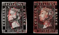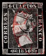 Spanje 1850 - Isabella II. 6 cuartos black, Baeza type dater. Plate I, types 1 and 2. One from Adra, Almería. - Edifil 1