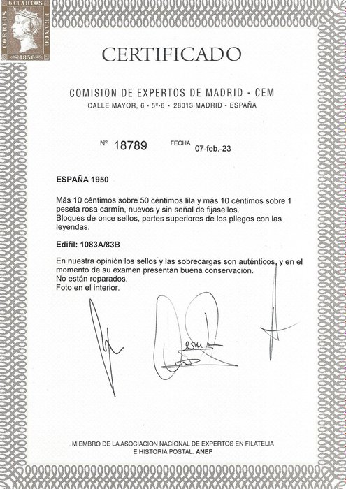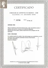 Een zwart-wit fotokopie van het CEM-certificaat van echtheid van het blok van 11 zegels waartoe deze serie behoort wordt meegeleverd. (Aangegeven met rode cirkels).