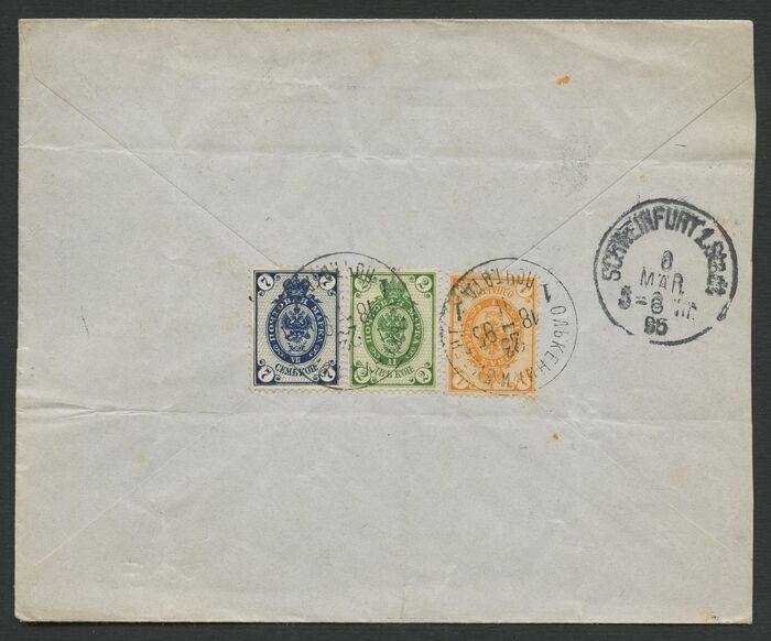 Brief met driekleurige frankering van 10 kopeken uit Rusland aan Schweinfurt Duitsland gedateerd 23-11-1895. Interessant.