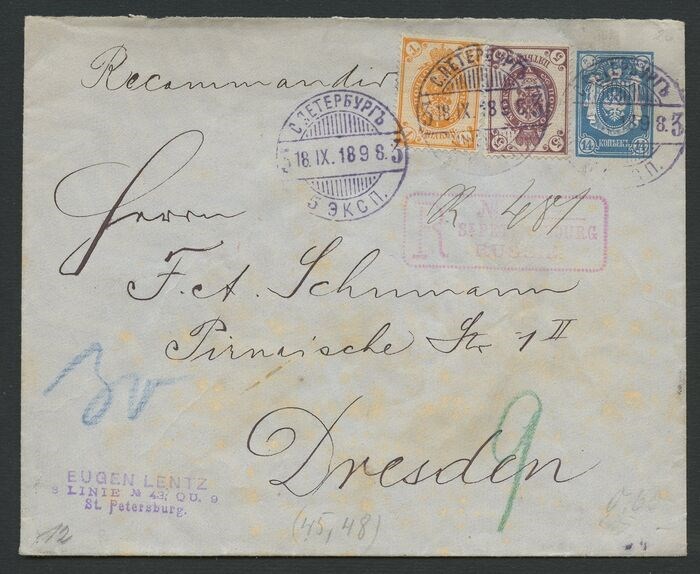 Aangetekende brief met driekleurige frankering van St. Petersburg naar Dresden gedateerd 18.IX.1896. Postwaardestukken van 10 kopeken met aanvullende frankering van 6 kopeken. Interessant.