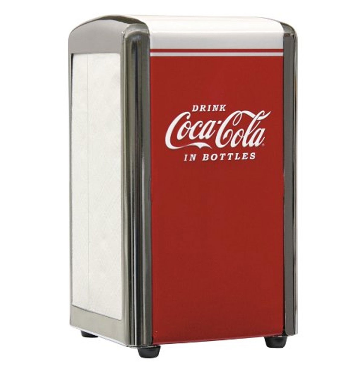 Relive the nostalgia of your childhood with this officially sanctioned napkin dispenser from Coca-Cola! The classic design evokes soda fountains, laughter and wholesome fun in our fast-paced modern society.Great Gift Idea For The Coca-Cola CollectorEasy To CleanVintage Look And FeelNapkins Not IncludedStandard Full Size Dispenser