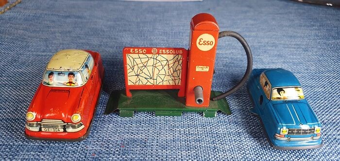 Groep van drie bestaande uit benzinestation met veermechanisme en twee Tekhnofix-wagens met veermechanisme.