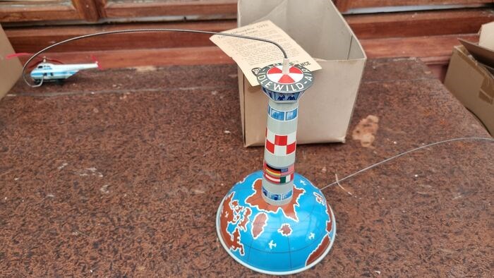 Sabena Paris Brussels 5040 Control Tower, Arnold France 1959. Helikopter van Sabena Airlines gemaakt in West-Duitsland. Originele doos, met 1 zijde open. Werkt met perfect krukmechanisme, maar de helikopter klimt moeizaam, de reden weet ik niet. Speelgoed in zeer goede staat, weinig mee gespeeld. Toelichting aanwezig. Zeldzaam