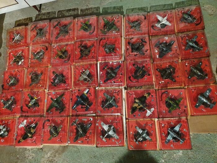 41 vliegtuigmodellen uit de Tweede Wereldoorlog, allemaal van metaal en edele kunststoffen, schaal 1:144, getrouwe reproducties van de originele modellen, zeer goed gedetailleerd, in nieuwe originele blisterverpakkingen, uit de collectie eind jaren 90, de 41 modellen wegen samen 15 kg