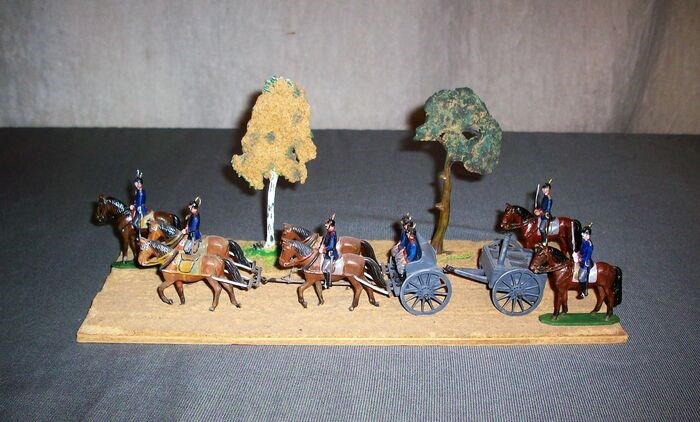De items zijn in zeer goede staat, ze vertonen lichte gebruikssporen, de twee bomen zitten niet meer stevig vastgelijmd aan het diorama (het afdekmateriaal zit er wel bij). De figuren, paarden en bomen zijn van omstreeks 1910-1945, de paarden en de veldkeuken zijn van omstreeks 1980-1985. Het diorama werd tentoongesteld in een museum in de voormalige DDR. Het schilderen van het team met de veldkeuken is uitgevoerd door figuurexperts van het museum en komt overeen met de originele kleuren voor de opgegeven periode.