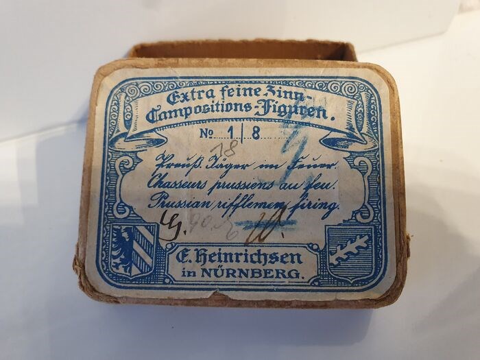 De figuren zijn gemaakt in de jaren 1920. opgenomen. Het is een originele doos met de opdruk "Extra fine tin composition figures. No. 1/8 E. Heinrichsen in Nuremberg" en extra opdruk "Preuss. jager in brand. Chasseurs Pruisens au feu. Pruisische rifflemen vuren." Een "18", een "G" en een "W" werden met de hand toegevoegd.