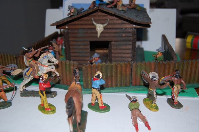 21 massafiguren Wild West van Elastolin en Tipple Topple Austria. Gebruikt, over het algemeen in goede staat, enkele materiaalscheurtjes en kleine materiaalverliezen.