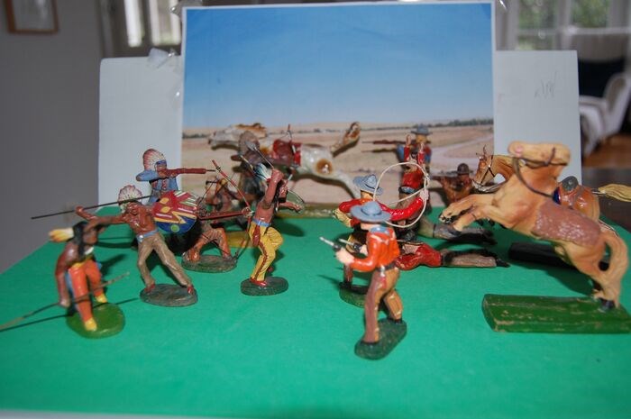 17 massafiguren Wild West van Elastolin en Tipple Topple Austria. gebruikt, goede staat (kleine scheurtjes in de stof als de paarden rennen).