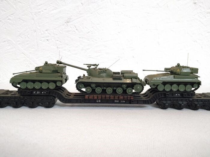 Heel bijzondere set. Goederenwagons met zeer gedetailleerde militaire voertuigen. Zelfs de antennes zitten er nog op. De twee met elk 3 voertuigen zijn gemerkt Fleiscmann, de andere niet. De jeep hierop lijkt het mitrailleur te missen.